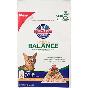 Hill's Science Diet, Hill's Science Diet Ideal Balance Mature Adult Cat Food Chicken and Brown Rice DinnerHill's Science Diet Ideal Balance Mature Adult Cat Food Chicken and Brown Rice Dinner is recommended for senior cats 7 years and older. This highly digestible formula combines fresh chicken, fruits and vegetables with added vitamins, minerals and amino acids to create advanced nutrition in a senior cat food that is perfectly balanced. This premium cat food has NO corn or artificial colors.Key Benefits:Overall health & vitality -- Vegetables like carrots, peas and broccoli are natural sources of vitamins, minerals, anitoxidants and phytonutrients.Healthy digestive system -- Brown rice, oats and barley are healthy sources fiber for digestive health.Healthy immune function -- Natural sources of antioxidnants from apples and cranberries plus vitamins C & E support your cat's immune system on a cellular level.Healthy skin & radiant coat -- Vegetable oil and flaxseed contains vital omega 3 & 6 fatty acids to support healthy skin and shiny coat.Lean muscle -- High-quality, digestible protein from fresh chicken & egg builds and maintians lean muslcle.